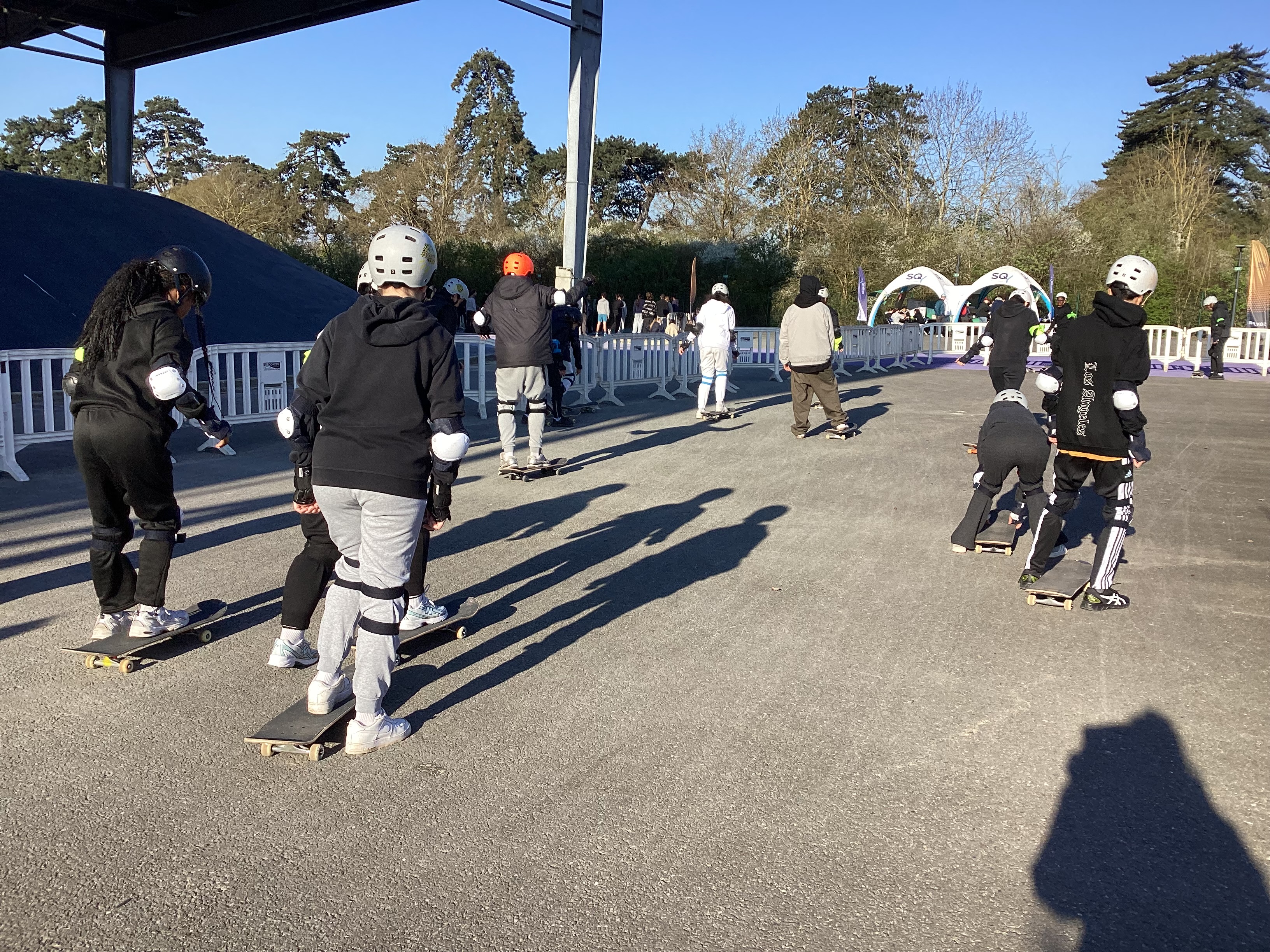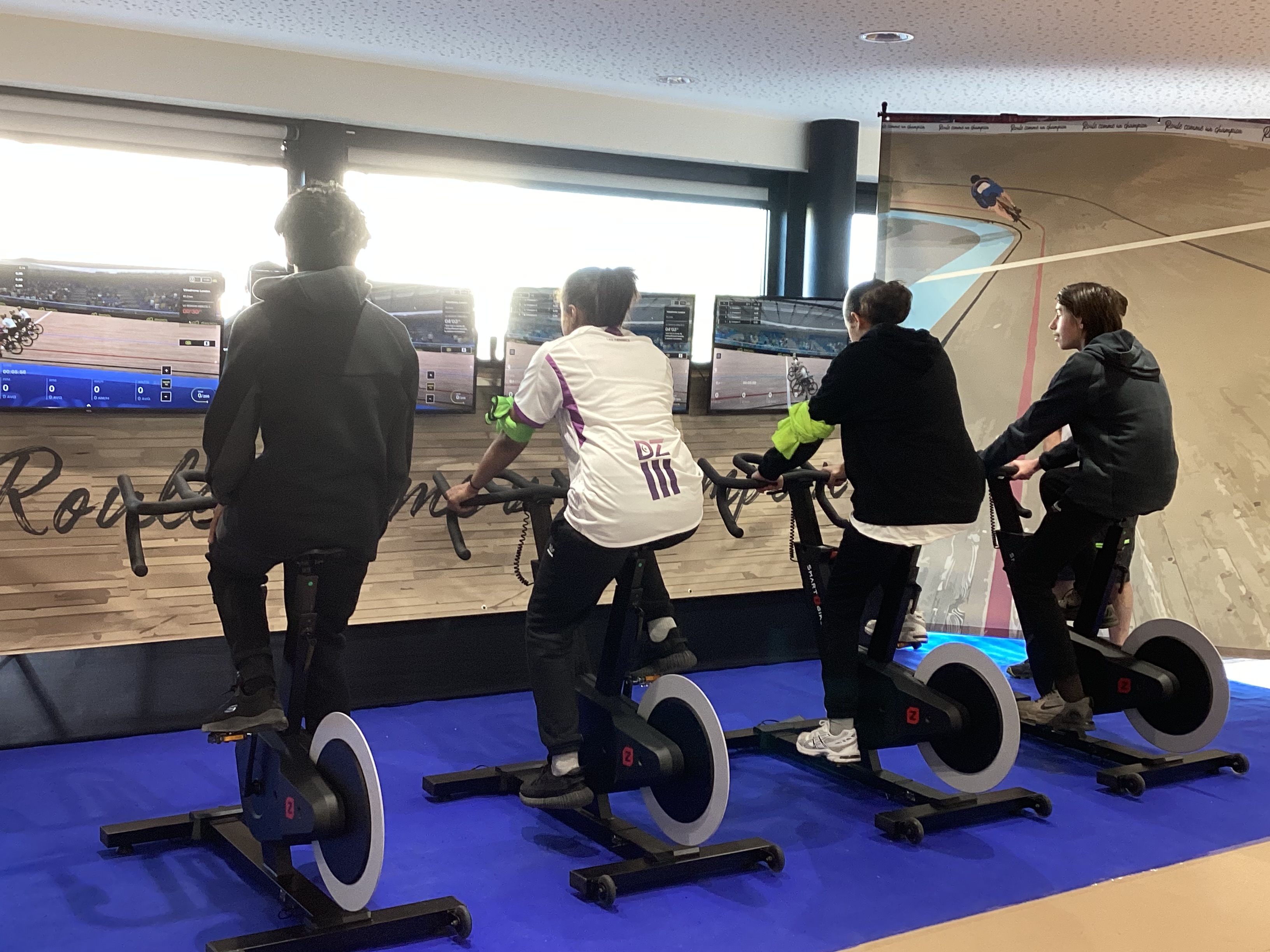 Mercredi 2 au matin, c’est au vélodrome national que les 3è avaient rendez-vous. Ils ont eu la chance de pratiquer du BMX, une initiation skate-board, un atelier street art et pour finir, ils se sont lancés dans une folle course poursuite de cyclisme sur piste virtuel. Ils ont pédalé en se relayant pour tenter de battre le record établit par un groupe précédent. Ils sont arrivés second à très peu de choses (quelques mauvaises réponses au quizz simultané à la course).