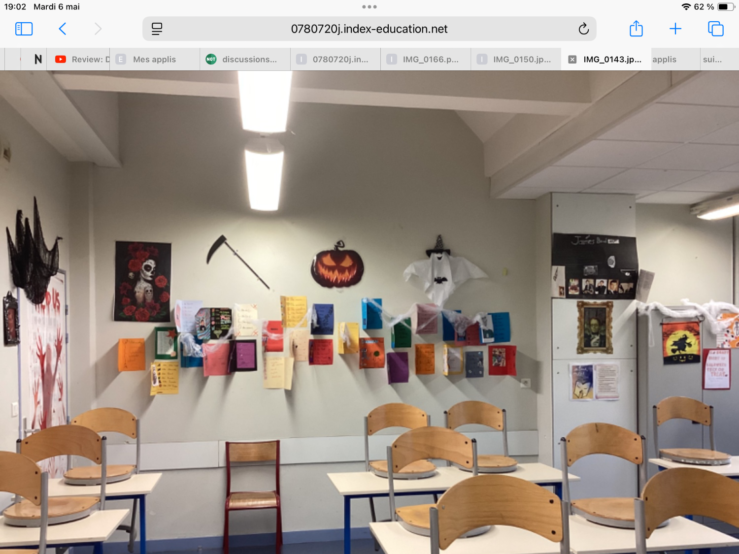 Learning English with Mrs Bavon. Here are some photos of what has been done by the pupils for Halloween. Look at the classroom ! Spooky, isn’t it ?