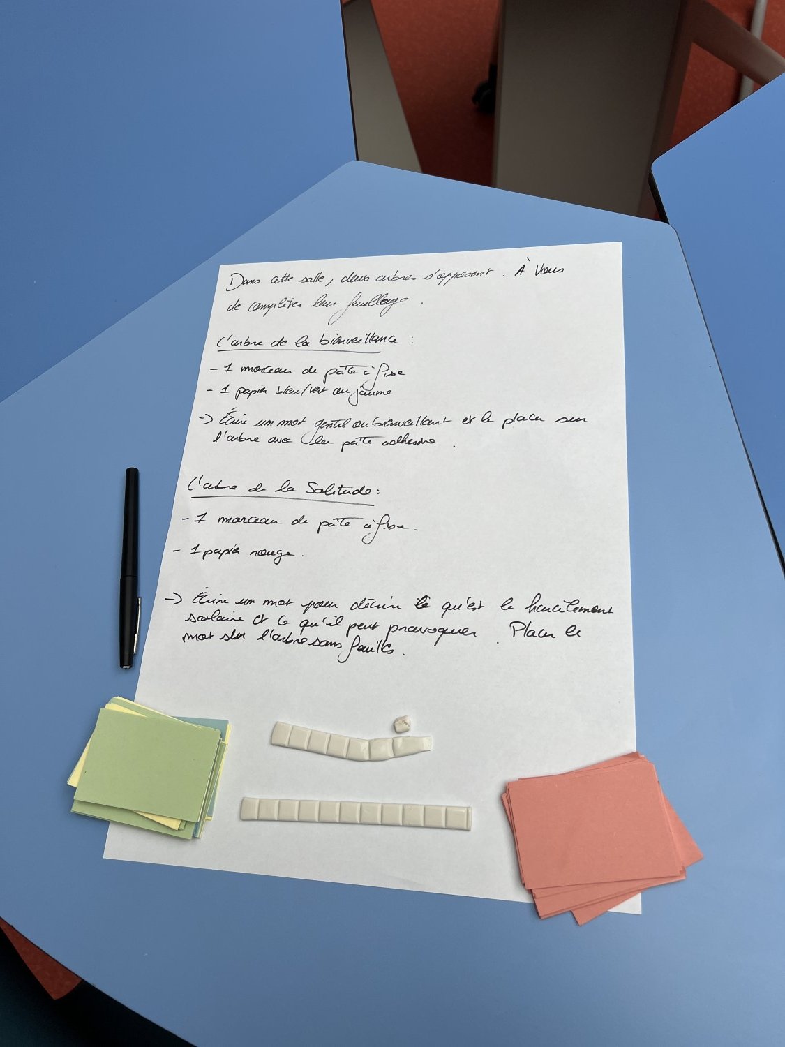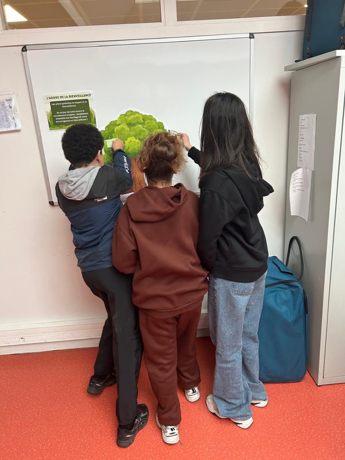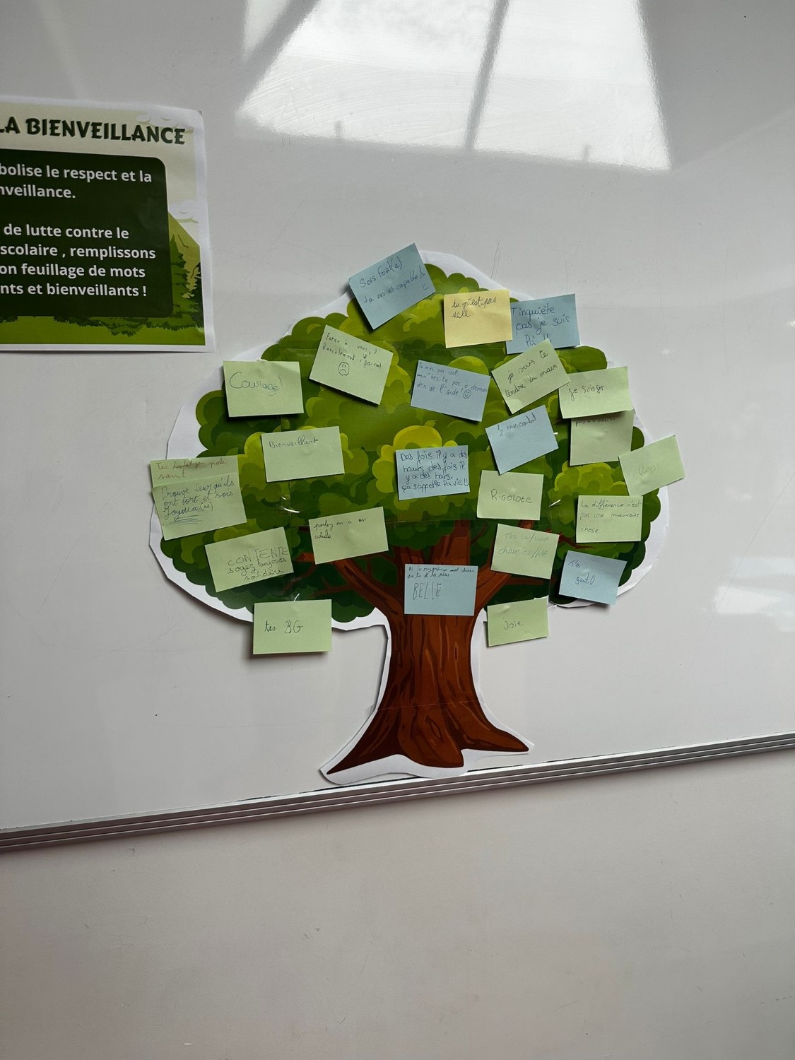 Sur le temps du midi, deux ateliers ont été proposés. Le premier atelier était composé de deux arbres : un arbre de l’espoir, sur lequel les élèves ont écrit des mots positifs, et un arbre des mots négatifs liés au harcèlement.