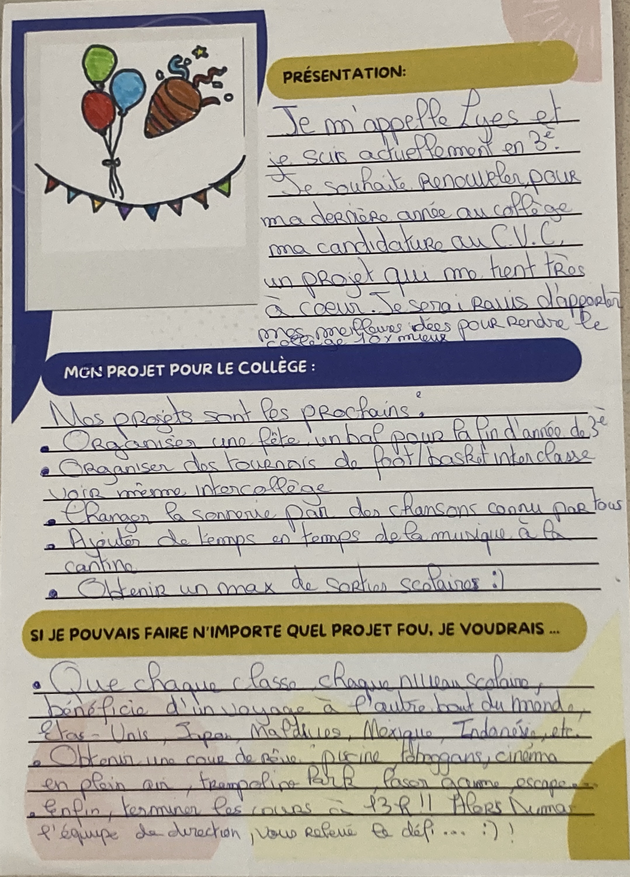 L’année dernière, j’avais également fait partie du CVC ; on avait fait moins de projets parce que c’était la première année de Mme Duchateau et qu’il a fallu du temps pour mettre en place le CVC ; mais cette année le CVC a été formé plus tôt avec des élèves volontaires et dévoués à la vie du collège et 2 CPE pour nous aider : on compte bien vous faire passer une super année 2025-2026 !